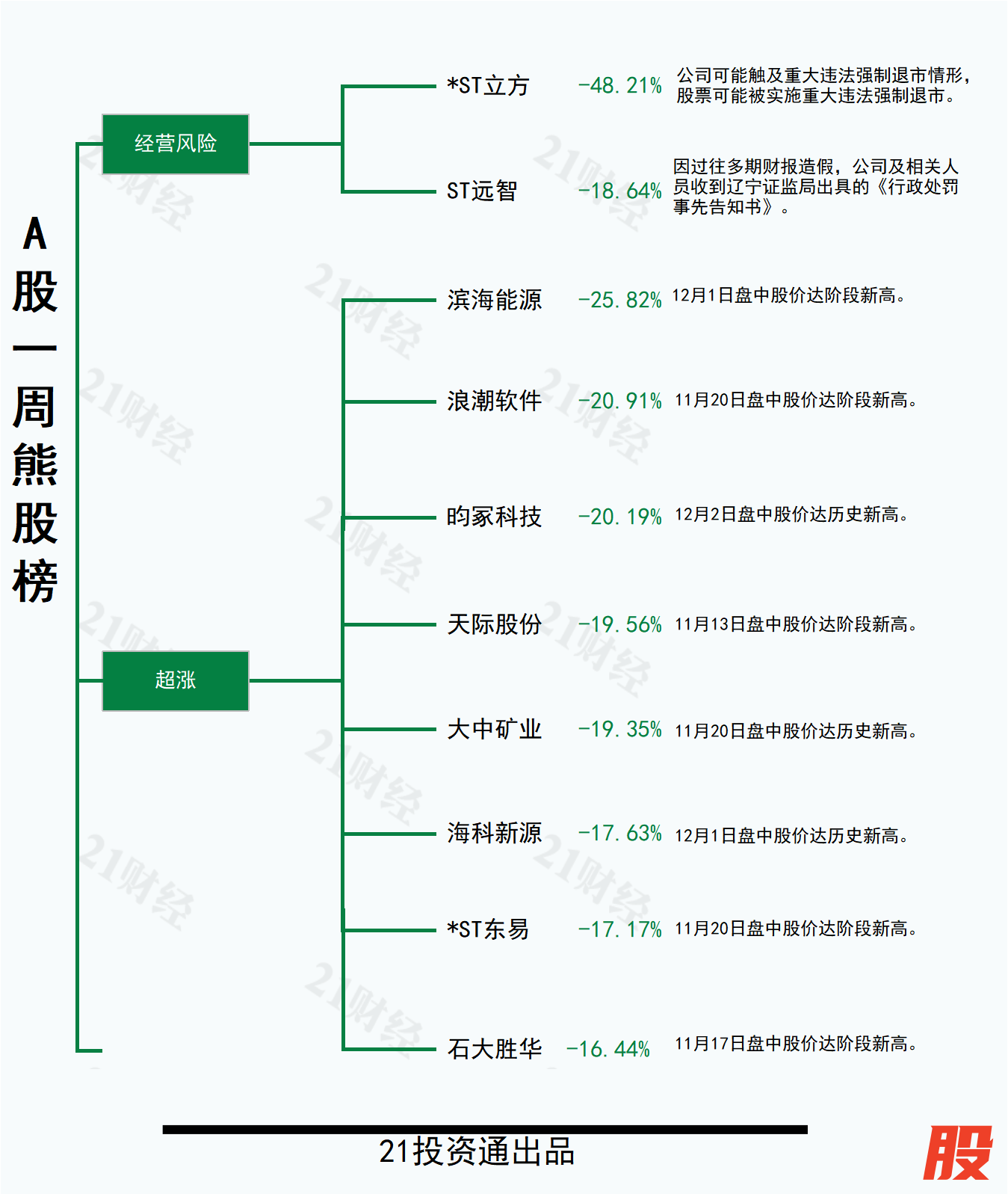 本期十大熊股中(剔除近一周上市的次新股),*ST立方(300344.SZ)周跌48.21%成为最熊股,滨海能源(000695.SZ)、浪潮软件(600756.SH)、昀冢科技(688260.SH)跌幅均在20%以上。本周熊股榜10只个股周跌幅均超16%。