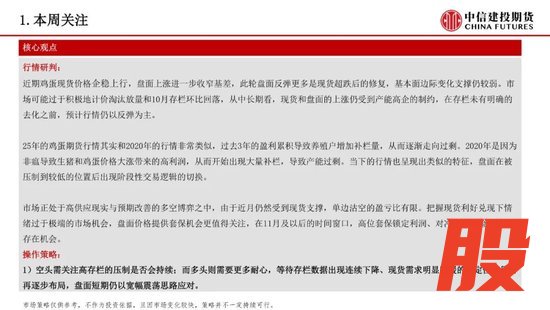 近期鸡蛋现货价格企稳上行,盘面上涨进一步收窄基差,此轮盘面反弹更多是现货超跌后的修复,基本面边际变化支撑仍较弱。市场可能过于积极地计价淘汰放量和10月存栏环比回落,从中长期看,现货和盘面的上涨仍受到产能高企的制约,在存栏未有明确的去化之前,预计行情仍以反弹为主。